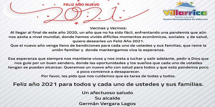 En este nuevo que se inicia en pocas horas más, el Alcalde de Villarrica, Germán Vergara Lagos, envía un afectuoso y fraterno saludo a las vecinas y vecinos de la comuna de Villarrica.