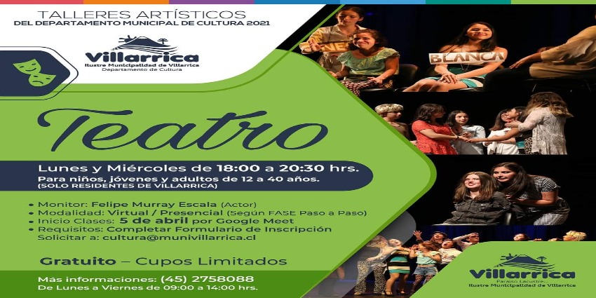 La Ilustre Municipalidad de Villarrica, a través del Departamento de Cultura, invita a la comunidad a participar del Taller de Teatro enfocado en la creación y formación artística, en el marco de los Talleres Artísticos 2021, que se inicia el próximo lunes 05 de abril, dirigido por el actor Felipe Murray Escala.