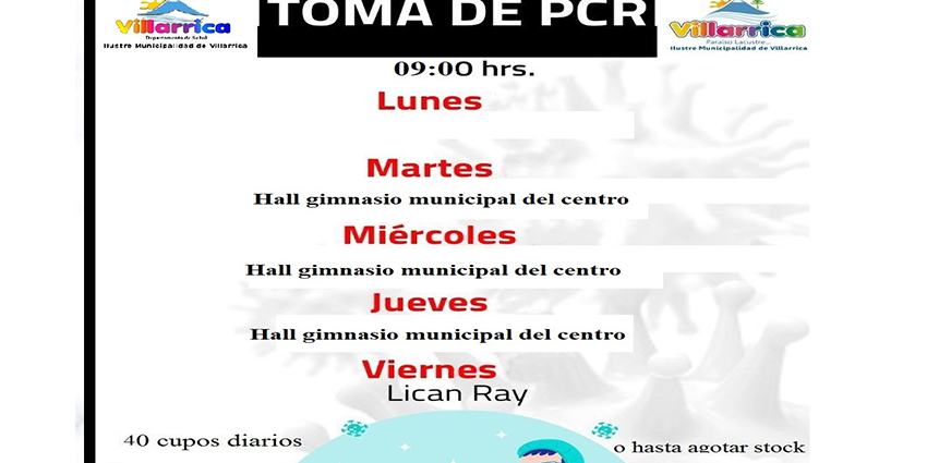 Recordar que de acuerdo al calendario establecido desde principios de este año, se instaló de lunes a jueves una dotación de funcionarios a un costado del edificio consistorial a realizar los exámenes, lugar que fue trasladado al hall del gimnasio municipal Carlos Martínez producto de la condición climática. En tanto, los días viernes, los exámenes se realizan en el CESFAM de Licán Ray.