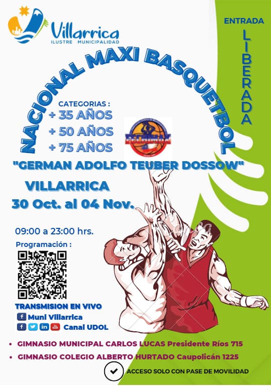 La Federación Chilena de Maxi Básquetbol sede Villarrica, invita a la comunidad al Campeonato Nacional de Básquetbol “Germán Adolfo Teuber Dossow” en categorías 35, 50 y 75 años; que tendrá lugar desde este sábado 30 de octubre al jueves 4 de noviembre, en Villarrica.