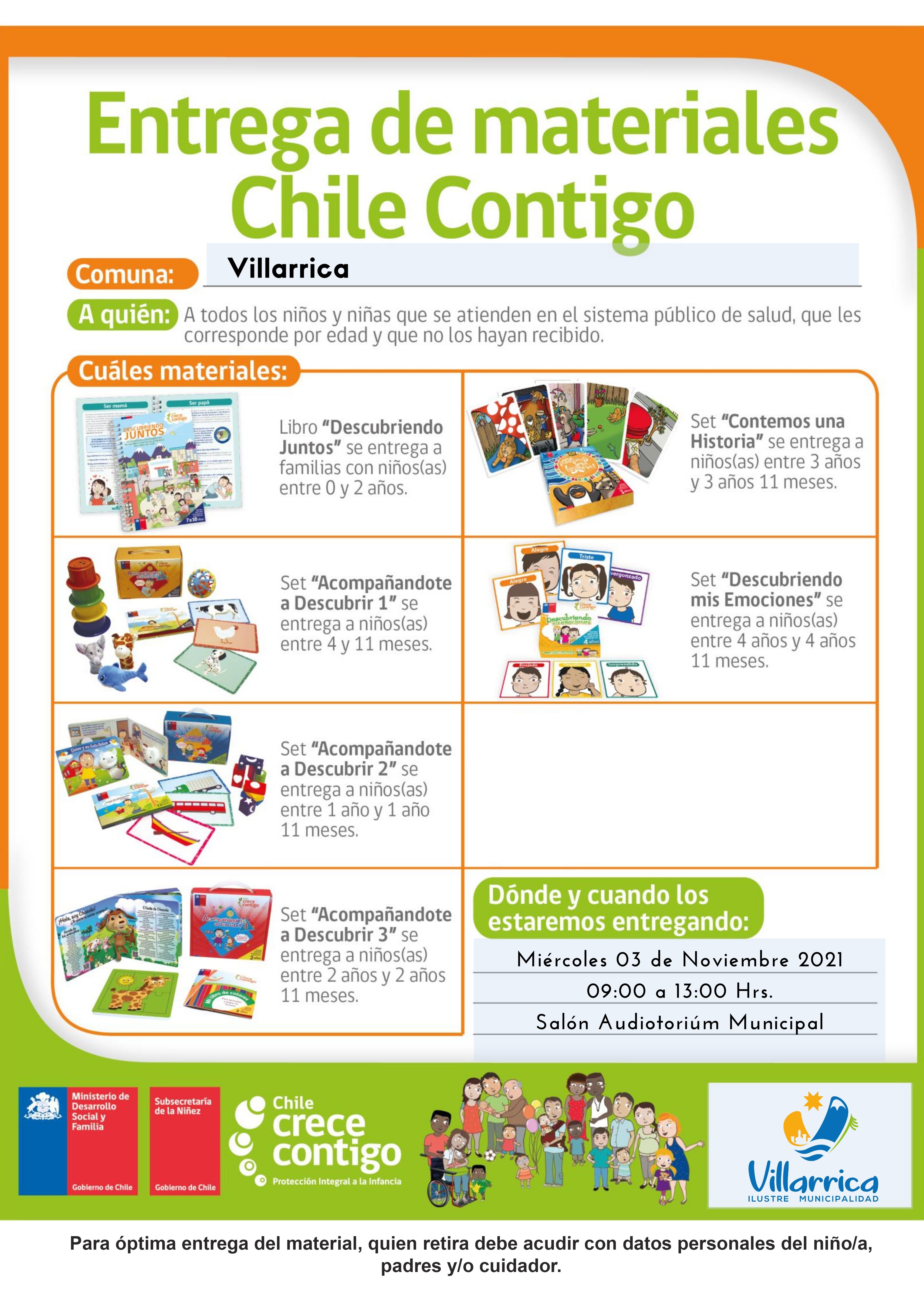 El programa Chile Crece Contigo Villarrica, informa que realizarán tercer operativo de entrega de material de estimulación y apoyo para la crianza, dirigido a todos los niños y niñas de la comuna entre 0 a 4 años de edad, que no han recibido el material en sus controles de niño sano, por contexto de pandemia.