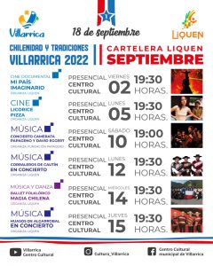 No obstante, el macizo programa de actividades durante septiembre en Villarrica, en el marco de este Mes de la Patria, continuará con la actuación de “Los Corraleros de Cautín”, en un concierto definido este lunes 12 de septiembre a partir de las 19.30 horas, siempre en Liquen Centro Cultural.