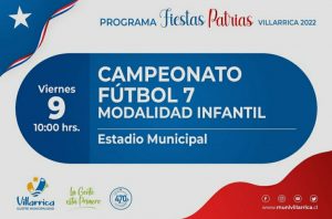 Para este viernes 9 de septiembre, está programado un Campeonato de Fútbol-7, modalidad infantil, el que es organizado por la Unidad de Deportes de la entidad edilicia local y el que se desarrollará a partir de las 10 de la mañana en el Estadio Municipal “Matías Vidal”.