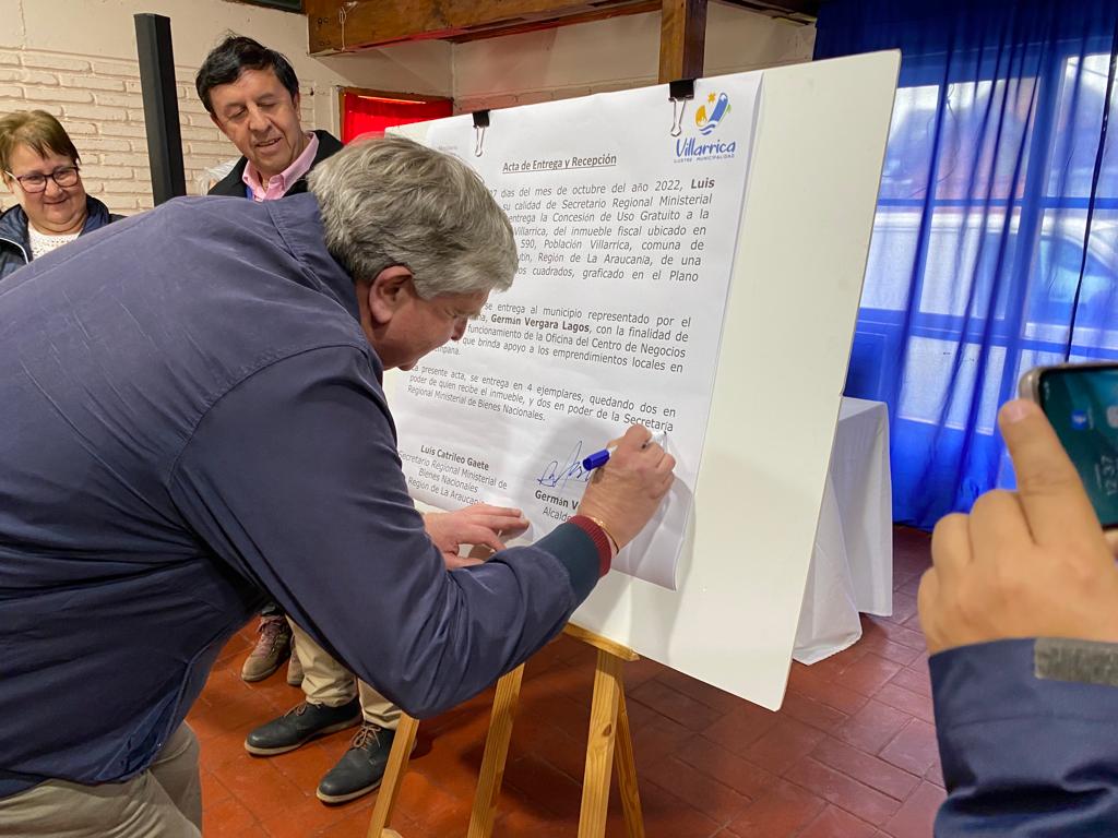 Hasta Villarrica llegó hace algunos días la labor de Bienes Nacionales, gracias a la entrega de títulos de dominio y, además, de dos acuerdos de concesiones entre el organismo regional y la administración municipal a cargo del alcalde Germán Vergara, quien rubricó los documentos, junto al Seremi del ramo, Luis Catrileo.