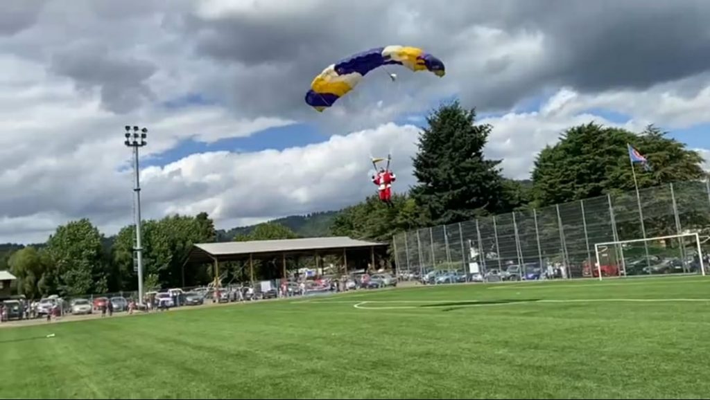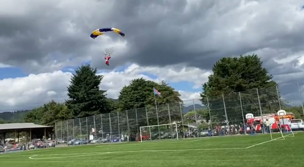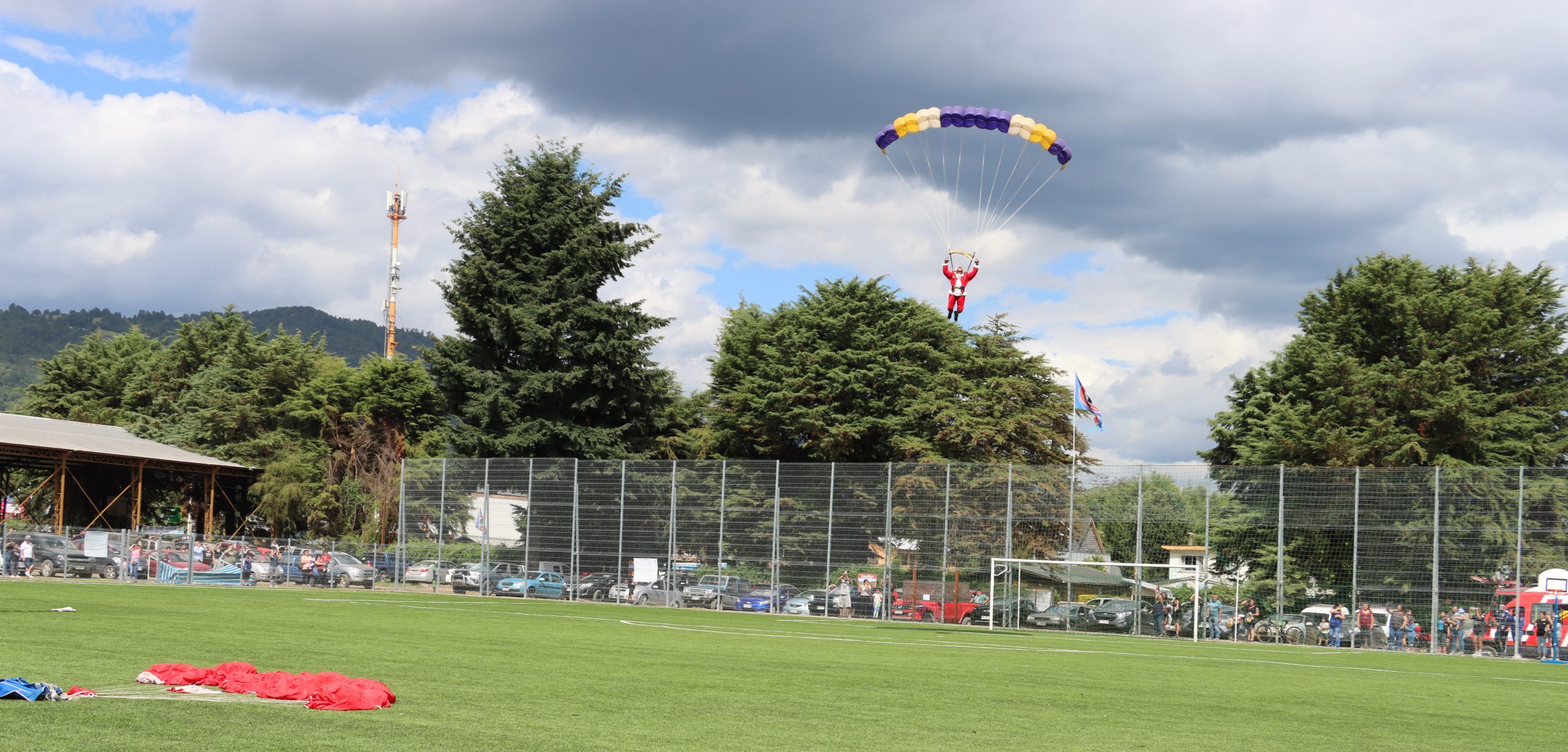 Fue el Club de Paracaidismo de Villarrica, el que -por gestión del alcalde Germán Vergara- aportó con su logística para ver caer el perfecto aterrizaje y corriendo al personaje estrella de la jornada, ataviado de su tradicional traje Rojiblanco.