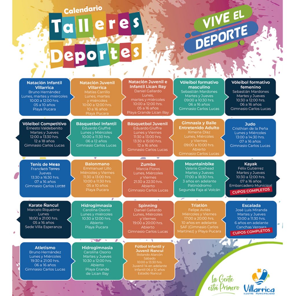 Los talleres disponibles y sus responsables son: Natación, a cargo de Bruno Hernández; el área juvenil, con Matías Carrillo, Juvenil e Infantil en Lican Ray, a cargo de Daniel Gallardo en Playa Grande; vóleibol formativo masculino, con Sebastián Mardones, el formativo femenino y el competitivo, con Ernesto Valdebenito; básquetbol infantil, con Eduardo Giuffré, básquetbol juvenil con Pamela Merino; gimnasia y baile entretenido para adultos con Ximena Díaz; judo, con Cristhian de la Peña; tenis de mesa, con Francisco Torres; balonmano, a cargo de Emmanuel Lillo en Playa Pucara; zumba, con Marcia Flores; mountainbike, a cargo de Valerie Coxhead para niños de 3 años en adelante en el Patinódromo Segunda Faja; karate Ñancul, a cargo de Marcelo Riquelme en la sede Villa Esperanza; hidrogimnasia, a cargo de Carolina Osorio en Playa Grande de Lican Ray y Pucara; Spinning, con Daniel Gallardo; triatlón, con Felipe Avilés; atletismo, bajo supervisión de Bruno Hernández; y fútbol infantil y juvenil en Ñancul, a cargo de Rolando Alarcón, en el Estadio Municipal de la localidad.