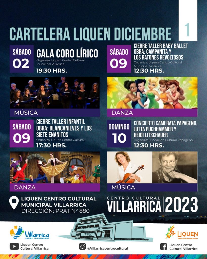 Asimismo, ya se iniciaron, el sábado 02 de diciembre, los actos de cierre de año, de los elencos estables de Liquen Centro Cultural, con la presentación del Coro Lírico Municipal, que dirige Ximena Holcomb, la que mostró en su repertorio: clásicos, ópera, un registro folklórico y de raíces mapuche, además de villancicos.