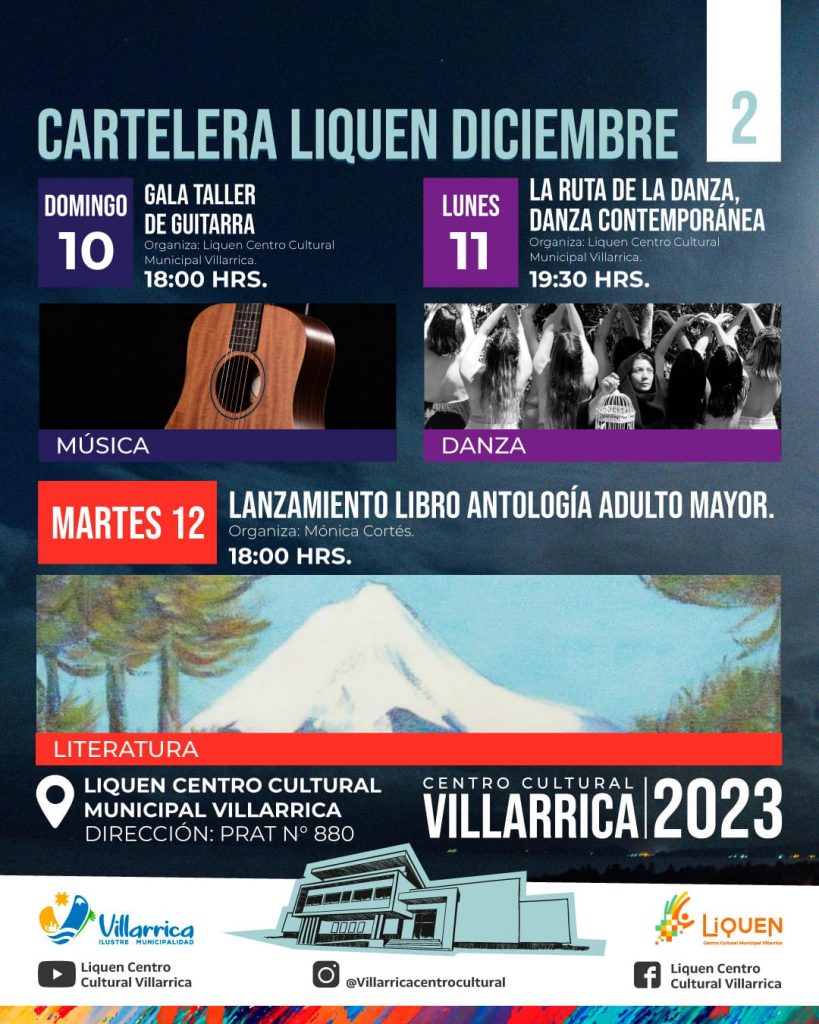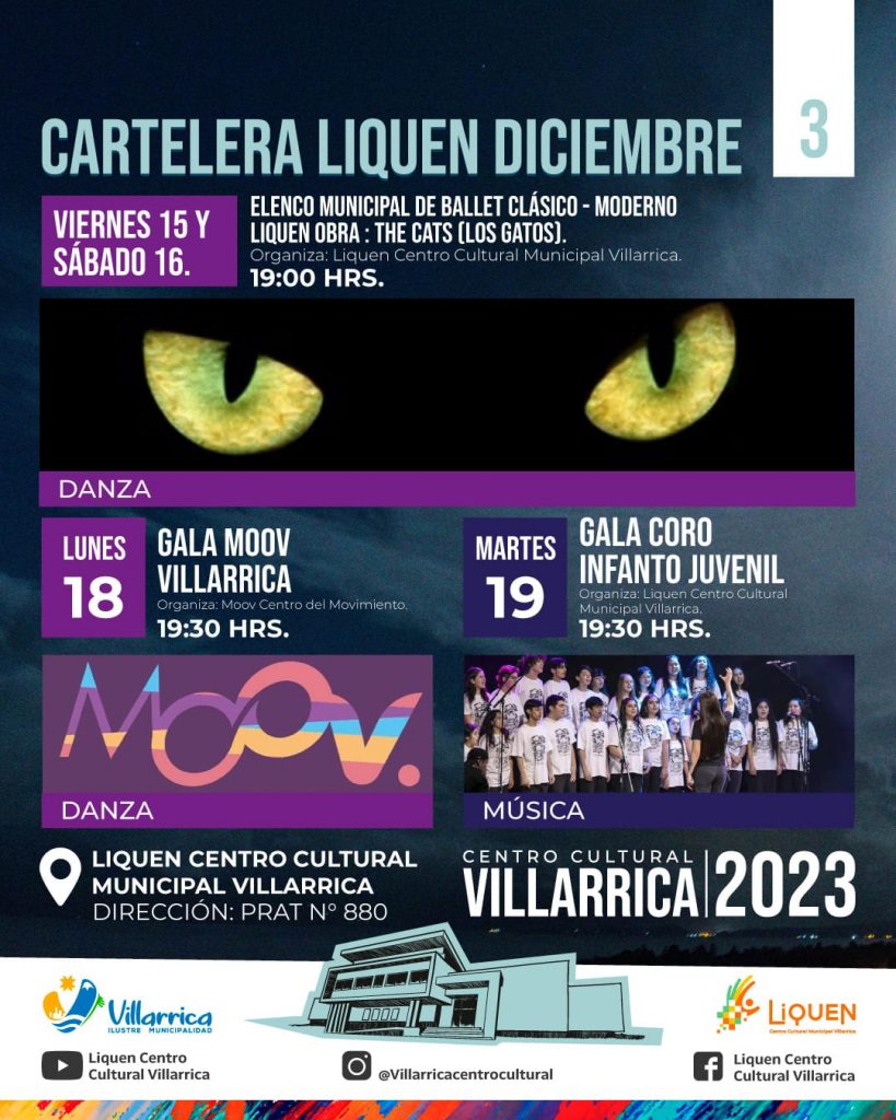 Para el lunes 18 Moov Centro del Movimiento, presentará Gala Moov Villarrica, a las 19:30 horas. En tanto, el martes 19 de diciembre, estará la Gala del Coro Infanto Juvenil Municipal, también a las 19:30 horas.