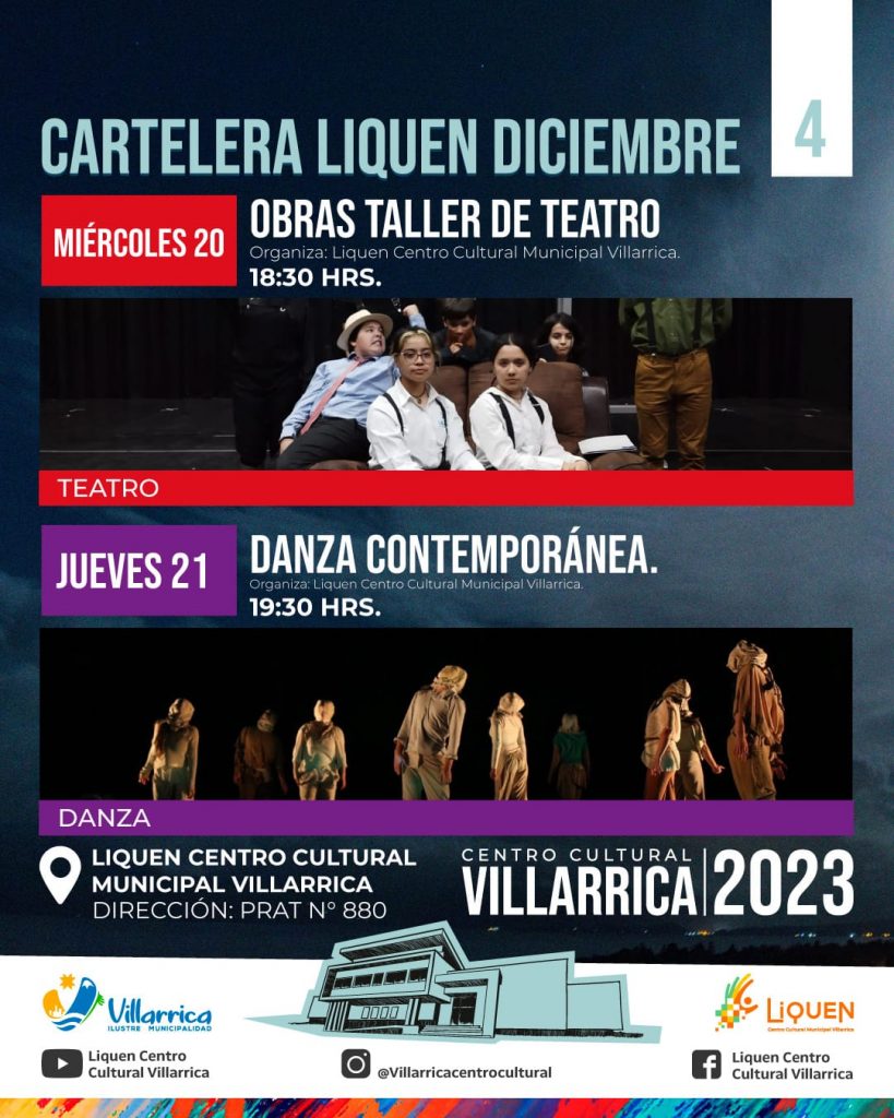 La cartelera Liquen continúa el miércoles 20 de diciembre a las 18:30 horas con las Obras del Taller de Teatro; y el jueves 21, Danza Contemporánea a las 19:30 horas en Liquen Centro Cultural Municipal.