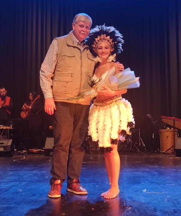 En la ocasión, recibió el agradecimiento del propio jefe comunal, quien le hizo entrega de un bouquet, manifestándole así el cariño de la gente y un agradecimiento del Municipio y del Centro Cultural, por apoyar con su virtuosa presentación al Ballet Folclórico Municipal.