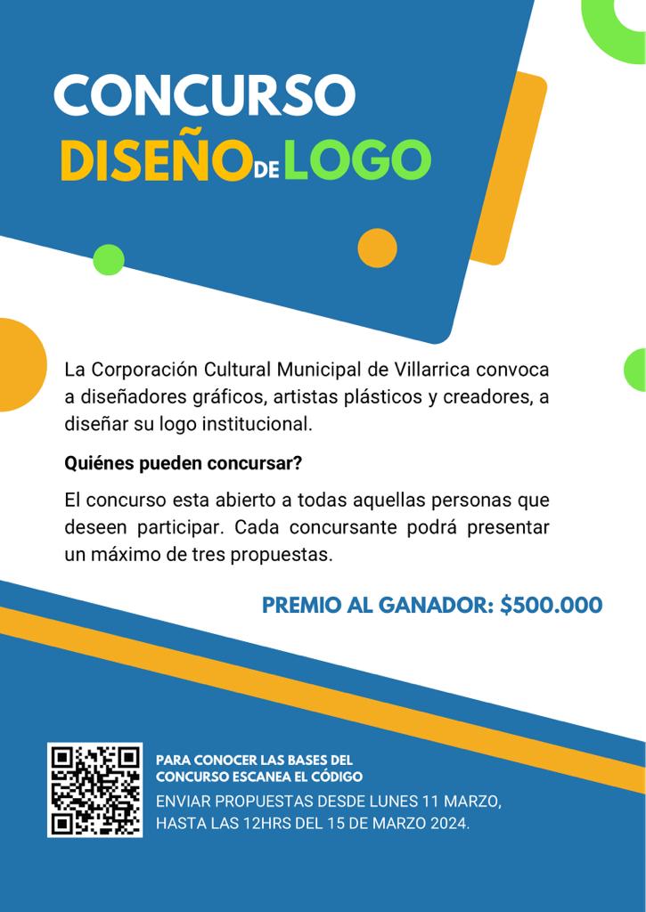 El premio al ganador será de $500 mil, por lo que los interesados en participar deben cumplir con ciertos requisitos; entre ellos que el diseño del logo debe ser original e inédito, deberá estar directamente relacionado con el ámbito de la cultura y las artes, tiene que incluir el nombre Corporación Cultural Municipal de Villarrica, fácilmente legible e integrado al diseño, legibilidad del logotipo e incorporar la creación un concepto de identidad local.