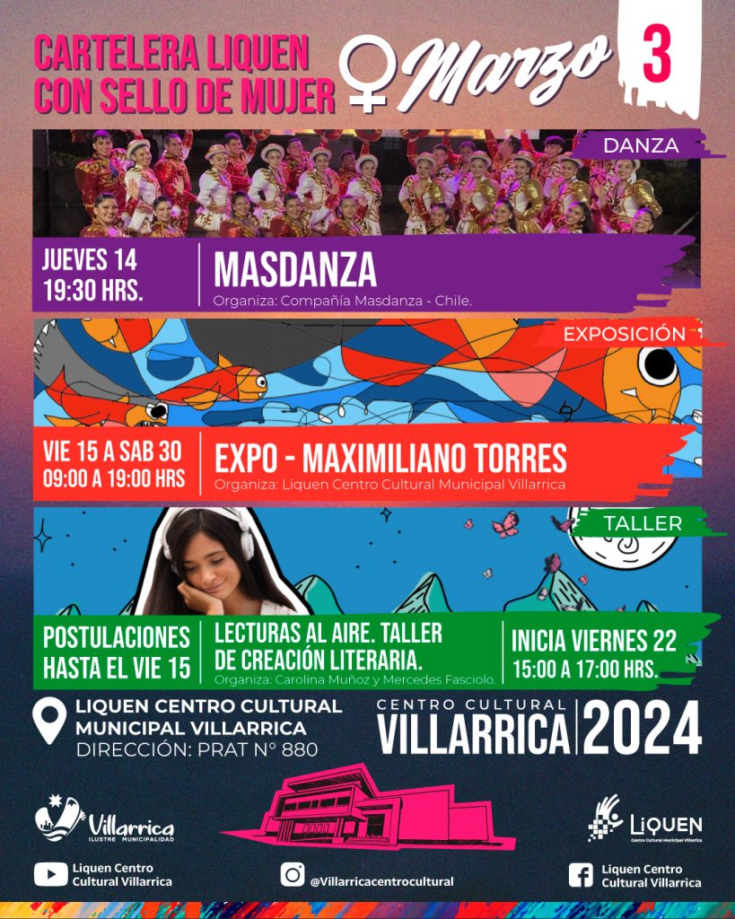 Para el próximo jueves 14 de marzo, siempre a partir de las 19.30 horas, se contempla la presentación de la agrupación artística de Pucón “Más Danza Chile”, siempre en el escenario del Liquen Centro Cultural Municipal de Villarrica, de Prat N°880.