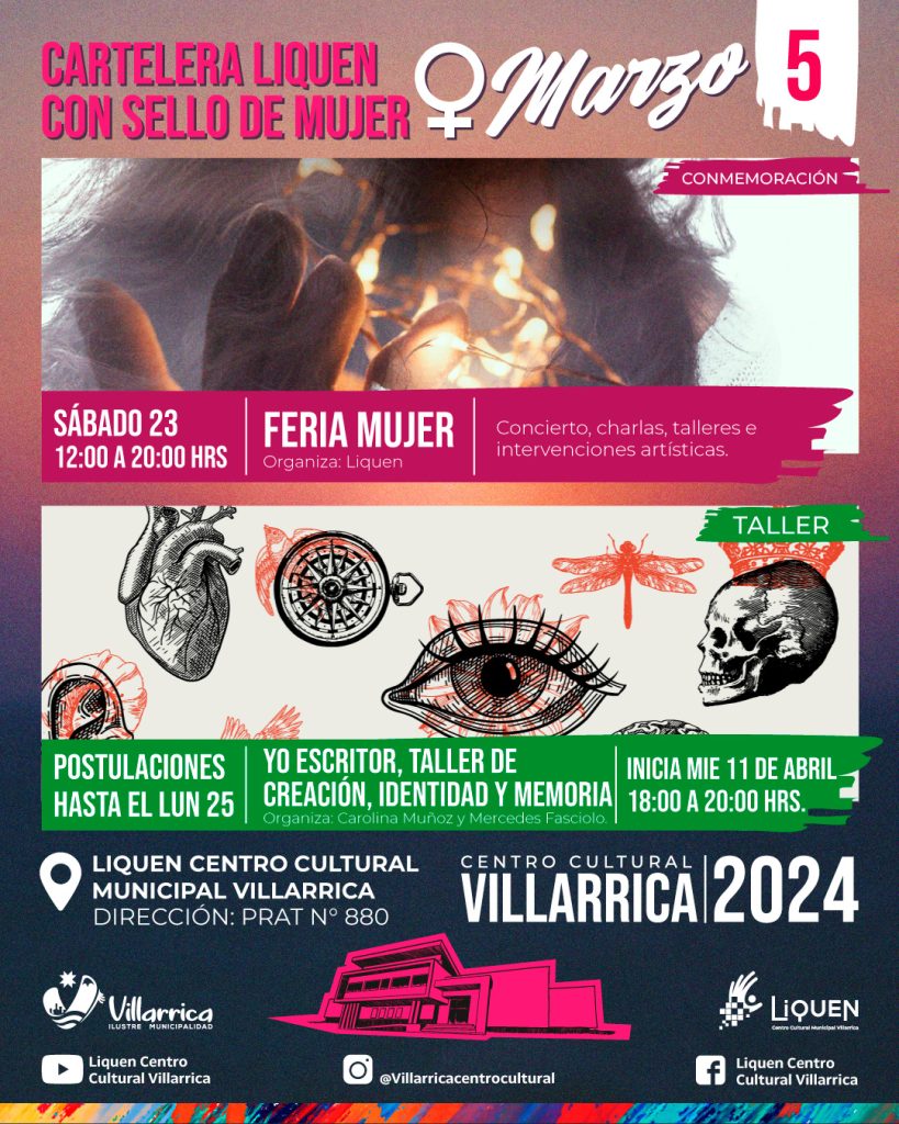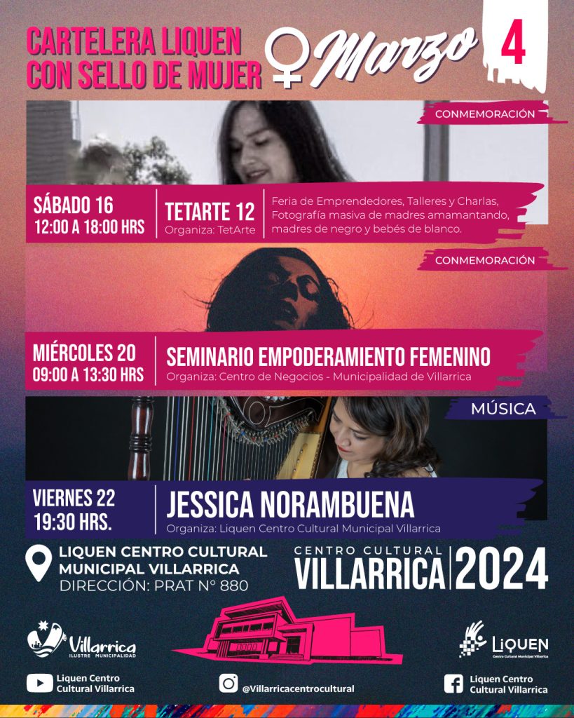 El mismo viernes 22 de marzo, pero a las 10.30 horas, se presentará la gran arpista local, Jéssica Norambuena Turra, sumándose el sábado 23 -entre las 12 y las 20 horas- Liquen Centro Cultural Municipal organizó la “Feria Mujer”, donde habrá concierto, charlas, talleres e intervenciones artísticas.