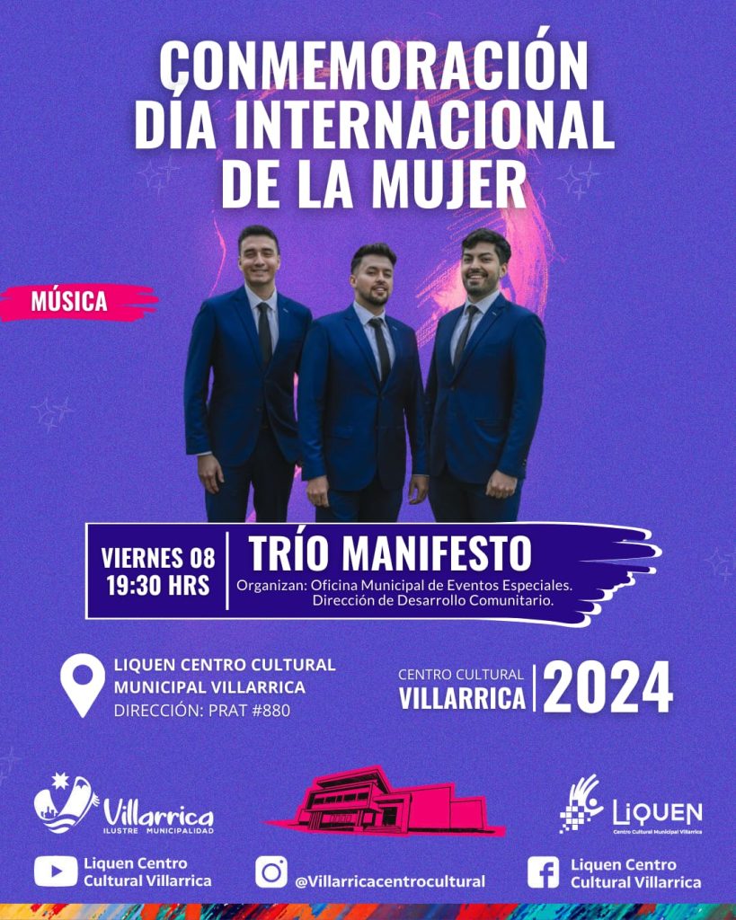 Posteriormente, a las 19.30 horas está programada la actuación del reconocido Trío Lírico Pop Manifesto, que ya se ha presentado en años anteriores en esta comuna y que con sus voces armoniosas han llegado al corazón de las damas.