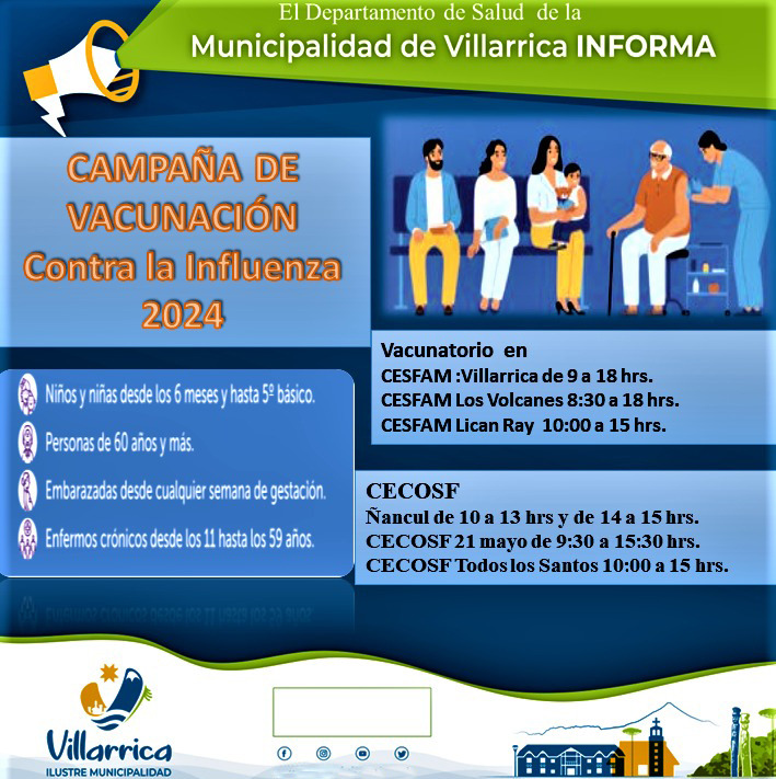 En los diferentes centros de salud de la red municipal se está inoculando a las personas en los siguientes horarios y lugares: En el CESFAM Villarrica, entre 10 y 18 horas; en Cesfam Los Volcanes, de 8.30 a 18 horas y en el Cesfam de Lican Ray, entre 10 y 15 horas.