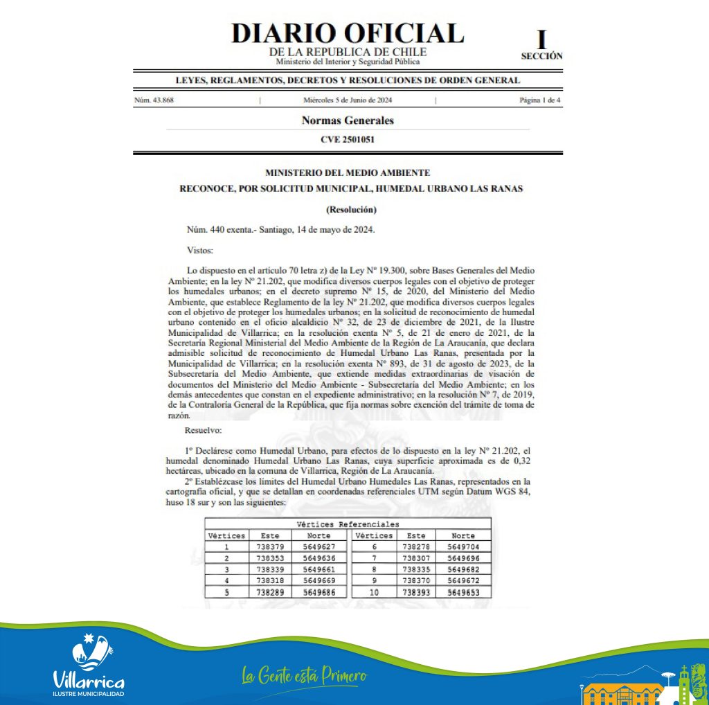 Con mucha alegría fue recibida en la Municipalidad de Villarrica la noticia de que, justo el pasado 5 de junio, Día Mundial del Medioambiente, se haya publicado en el Diario Oficial la resolución que decreta oficialmente, como Humedal Urbano el sector conocido como “Las Ranas” en Villarrica, ubicado en la ribera Norte del Río Toltén.