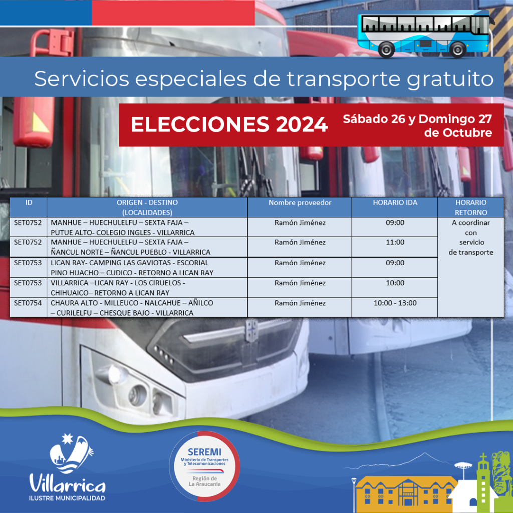 En relación al transporte público para sectores rurales, el coordinador electoral para habilitación de locales de la Municipalidad de Villarrica, Munnir Saphier, dijo que la Seremi de Transporte y Telecomunicaciones, ya envió los recorridos que habrá de manera gratuita para el acercamiento de la población rural. “En principio son todos los recorridos de semana habituales, que tienen los sectores rurales. Van hacer el mismo recorrido sábado y domingo, y además, se reforzó con servicios especiales por parte de la seremi, lo cual, ya se está informando por los medios de comunicación de la municipalidad”.