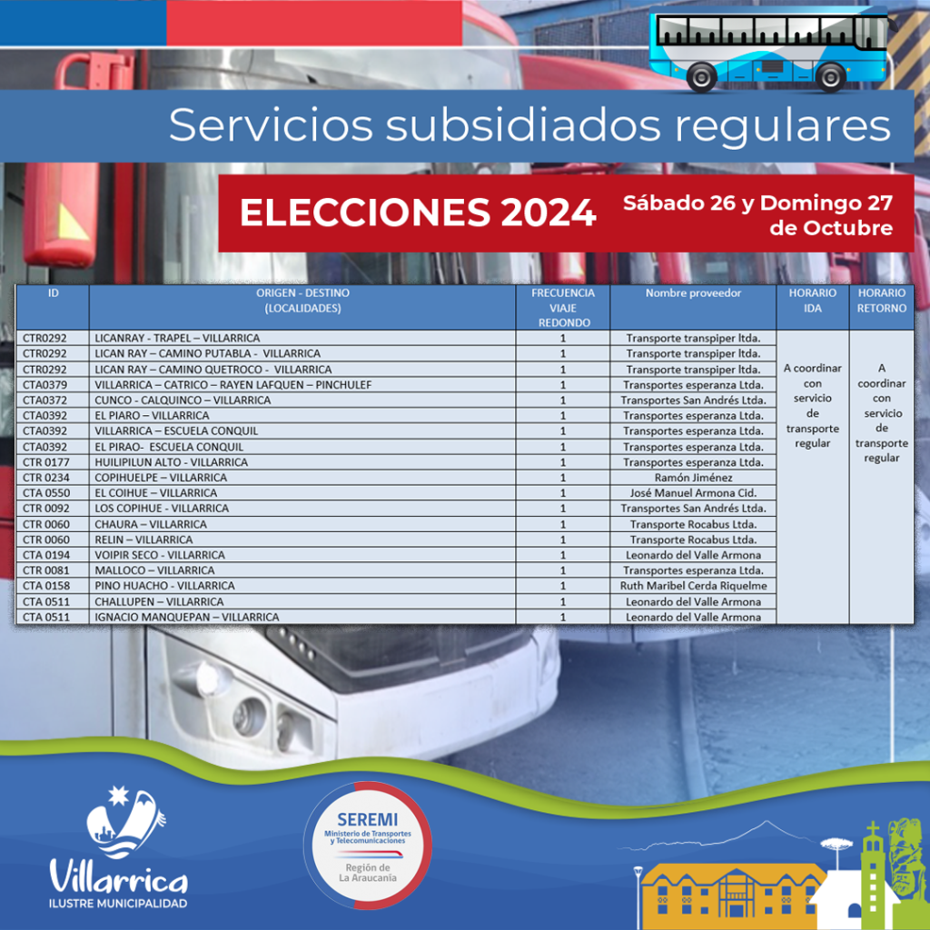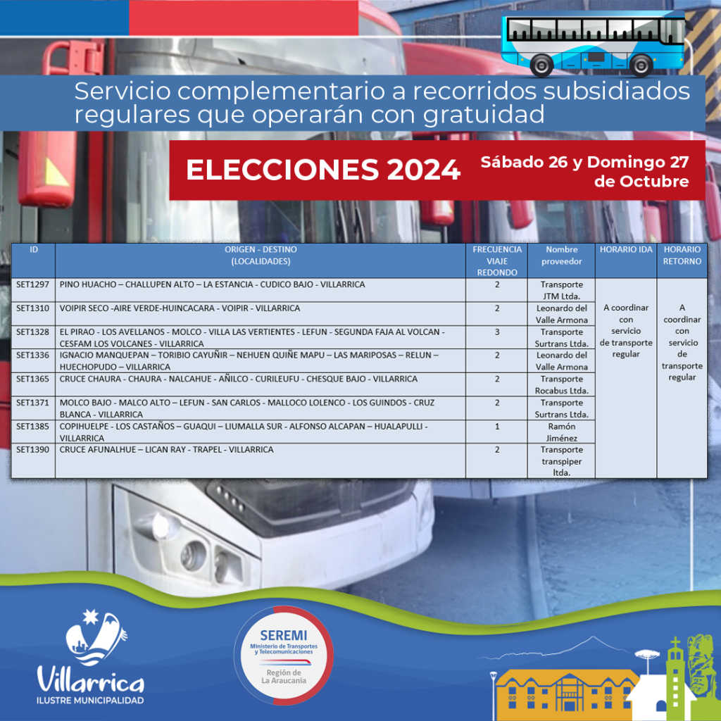 De esta manera, la municipalidad, en conjunto con la Seremi de Transporte y los operadores de los servicios en la zona, establecieron: Servicios Especiales Gratuitos, Servicios Complementarios a los Servicios Subsidiados Regulares más los Servicios Subsidiados Regulares, todo con gratuidad para las personas que se trasladas desde los sectores rurales, los que pueden revisarse en los medios oficiales de la Municipalidad de Villarrica. (Ver infografía).