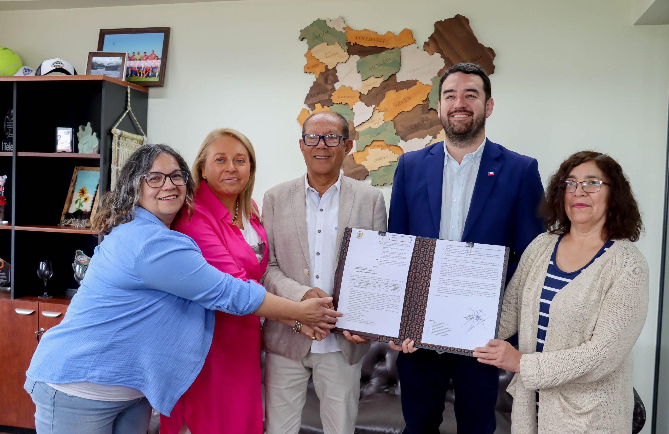 La firma se realizó en Temuco, donde el gobernador regional, Luciano Rivas firmó el documento, junto al alcalde Pablo Astete, la consejera regional y presidenta de la Comisión de APR, Gilda Mendoza, y las dirigentes del Comité de APR Huincacara-Voipir Seco, Carmen Sandoval y Nancy Sandoval.