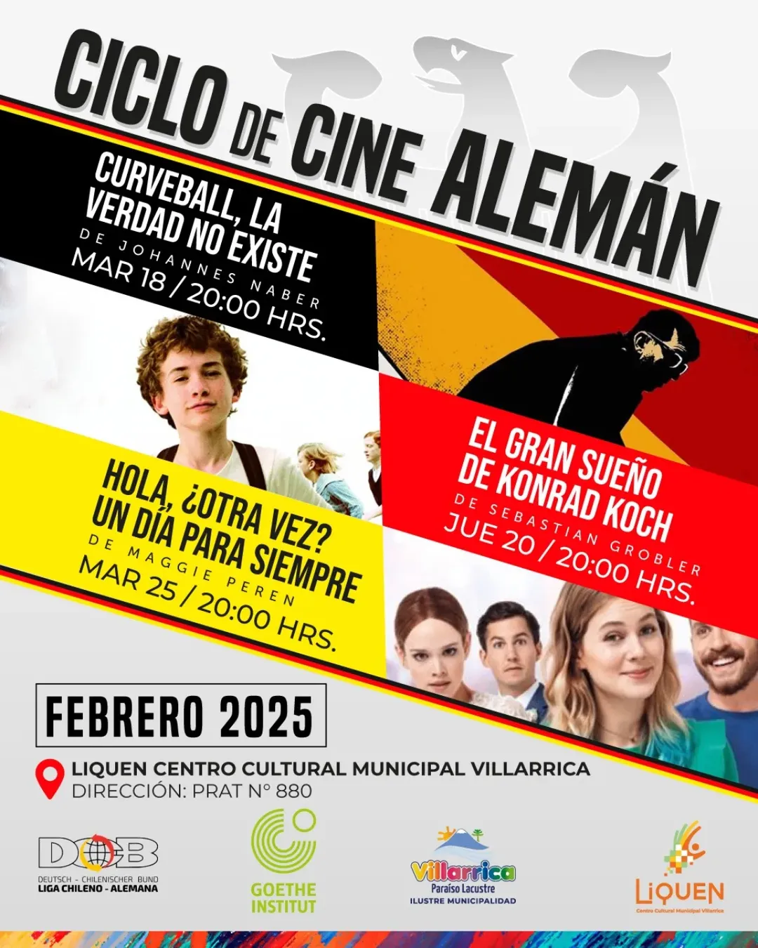 Esta semana se inicia el Primer Ciclo de Cine alemán que presenta tres obras de cine comenzando con el director Johannes Naber y su obra “Curveball, la verdad no existe” este martes, continúa con “EL gran sueño de Conrad Koch” del cineasta Sebastian Grobler el día jueves y concluye con el rodaje de Maggie Peren, “Hola, otra vez? un día para siempre” el martes 25 de febrero. Todas las películas serán exhibidas en la sala de teatro Liquen en horario de las 20.00 horas.