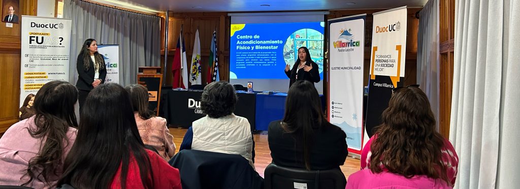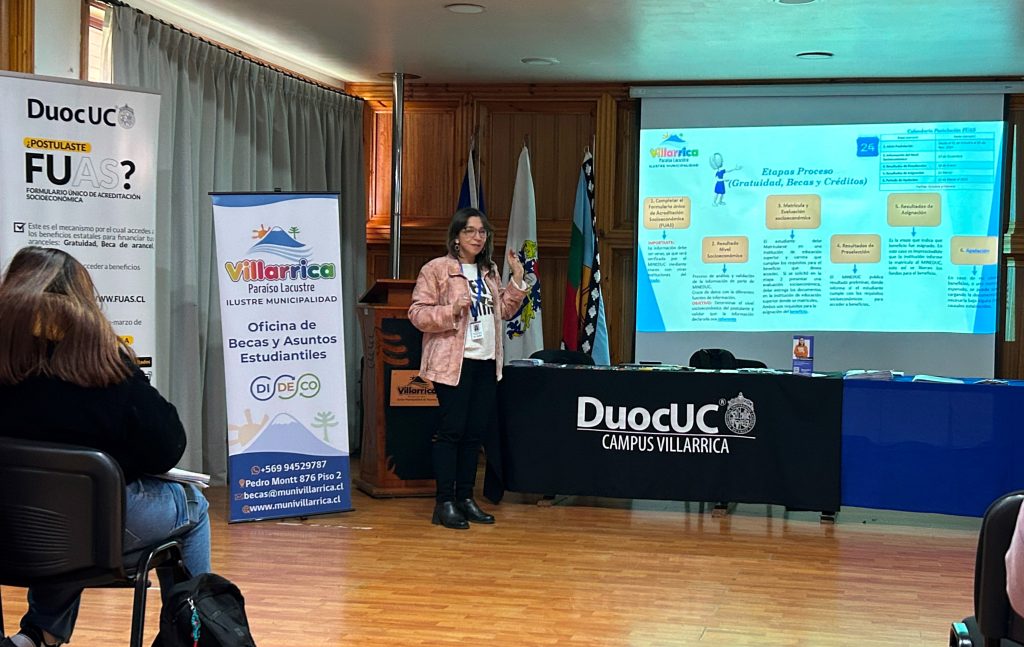 “El día de hoy estuvimos acompañando a la Oficina de Becas de la Municipalidad, mostrando las diferentes etapas de la postulación al FUAS, como el llenado y entregando ciertos tips muy importantes en este proceso tan relevante que se viene en la educación superior, que es el FUAS, para obtener beneficios estatales. También mostramos nuestra oferta académica en el Campus Villarrica, donde tenemos diferentes carreras de administración, de mecánica automotriz, entre otras. Contamos con becas internas, a las que los estudiantes, que no cuentan con los beneficios estatales, pueden postulas”, comentó Katherine Pavés Coordinadora Gestión y Continuidad Operacional DUOC UC.