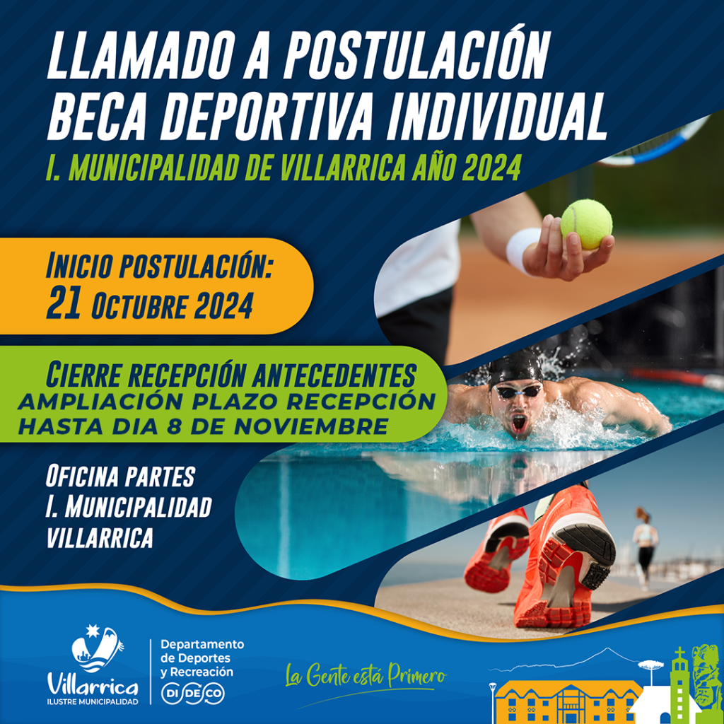 ATENCIÓN DEPORTISTAS… Se encuentran abiertas las postulaciones a BECAS DEPORTIVAS INDIVIDUAL 2024 I. MUNICIPALIDAD DE VILLARRICA, tiene por finalidad apoyar económicamente los diferentes proyectos deportivos a los deportistas en forma individual por un monto no superior a los $400.000 formulario y bases en la página web, para cualquier consulta o ayuda se encuentra disponible la Oficina de Deportes de la I. Municipalidad ubicada en Presidente Ríos 715, segundo piso, Villarrica deportes@munivillarrica.cl