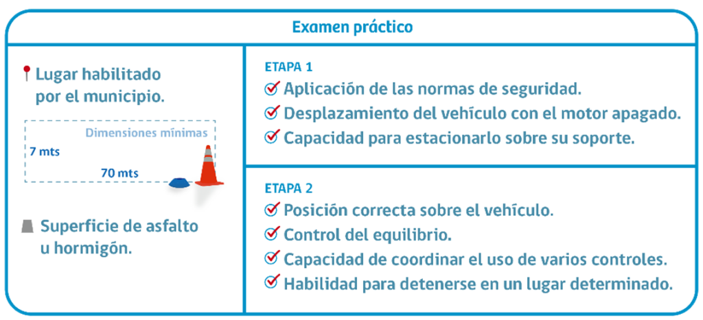 El examen estará compuesto de dos etapas. En la primera etapa se evaluará el conocimiento y cumplimiento de las normas de seguridad asociadas a la conducción del vehículo cuya conducción permite dicha clase de licencia y la capacidad para desplazarlo con el motor apagado y estacionarlo sobre su soporte. En la segunda etapa se evaluará la posición correcta del postulante sobre el vehículo, su control del equilibrio, su capacidad de coordinar el uso de varios controles (acelerador, embrague y freno), según corresponda, y su habilidad de detenerse en un lugar determinado.